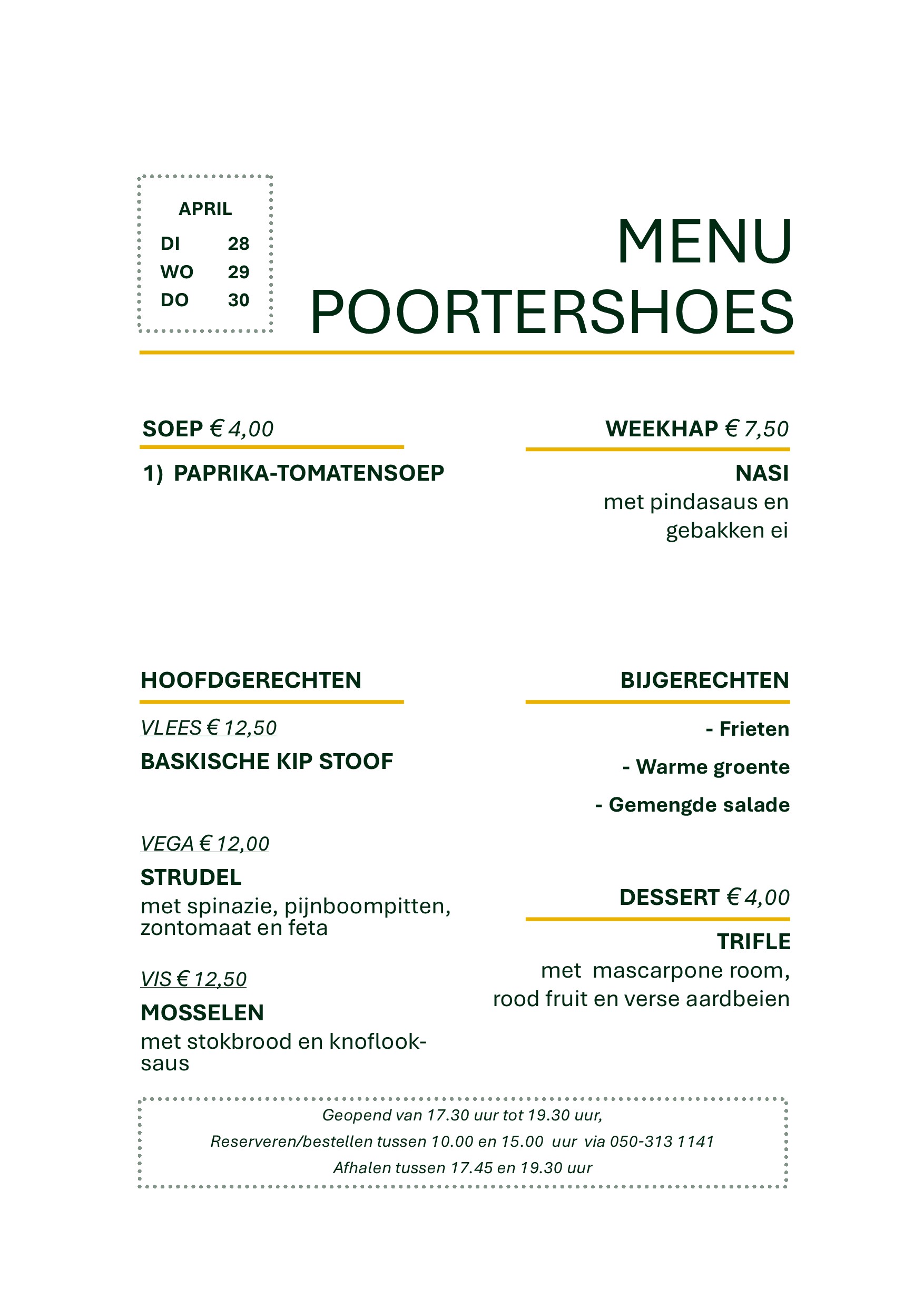 Graag telefonisch reserveren voor 15.00 uur via telefoonnummer 050-3131141. Afhalen is ook mogelijk.