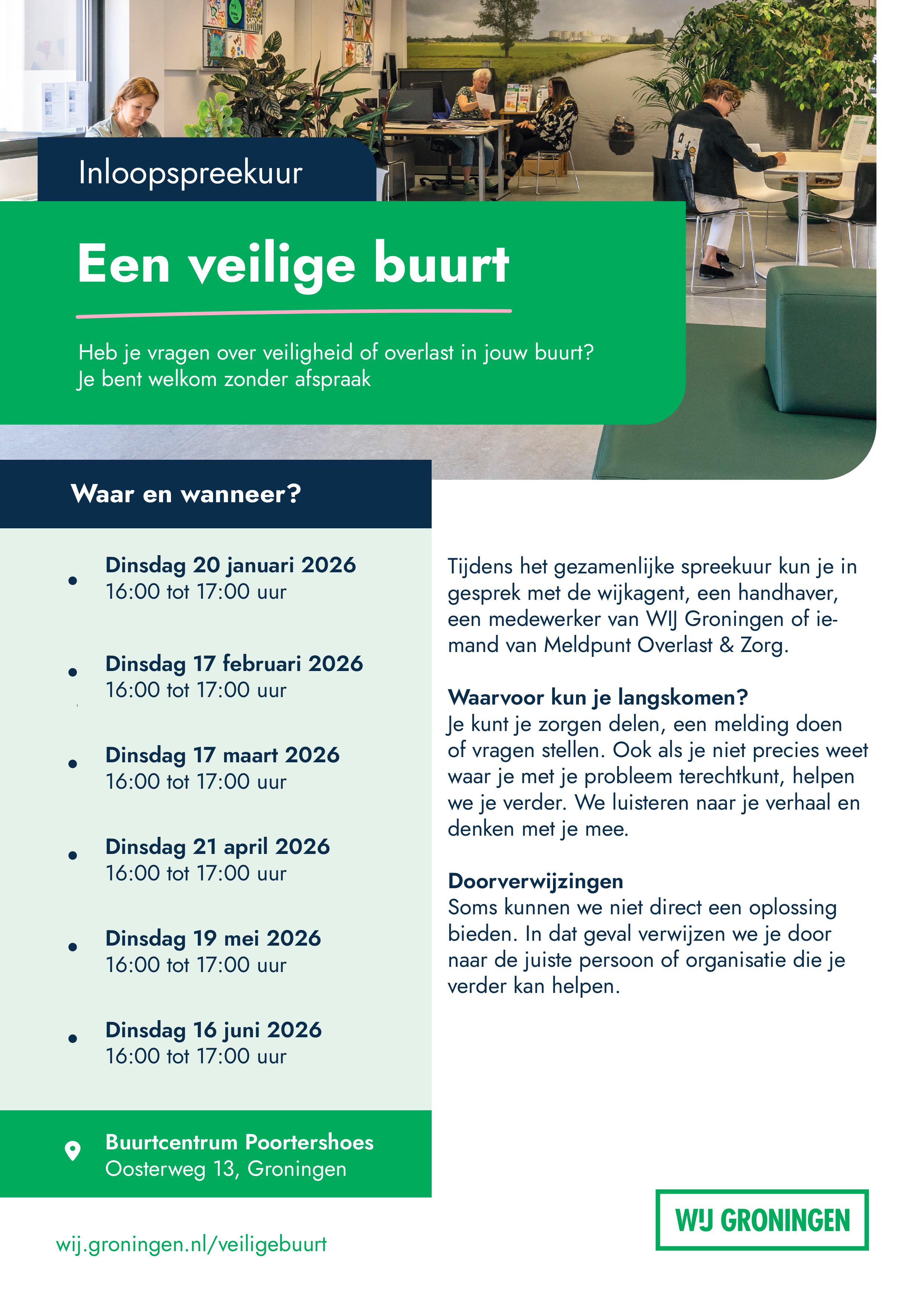 Tijdens het gezamenlijke spreekuur kun je in gesprek met de wijkagent, een handhaver, een medewerker van WIJ Groningen of ie mand van Meldpunt Overlast & Zorg.