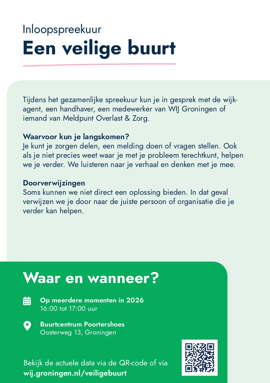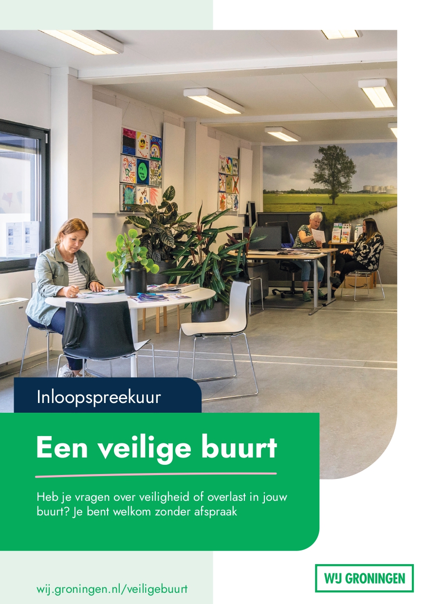 Tijdens het gezamenlijke spreekuur kun je in gesprek met de wijkagent, een handhaver, een medewerker van WIJ Groningen of ie mand van Meldpunt Overlast & Zorg.